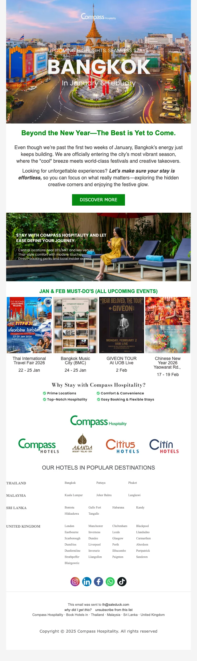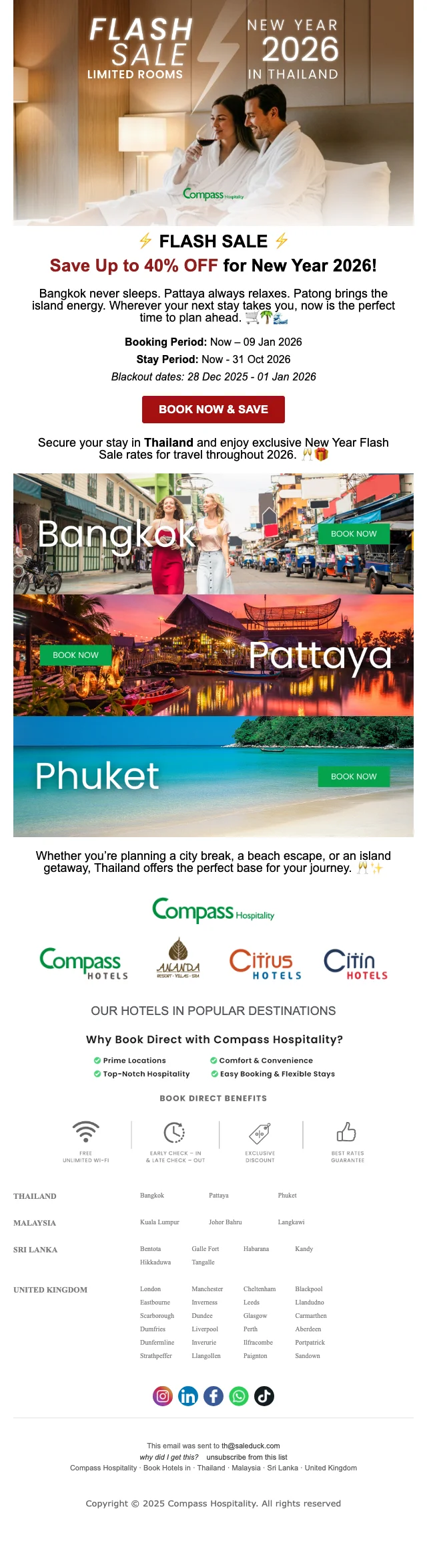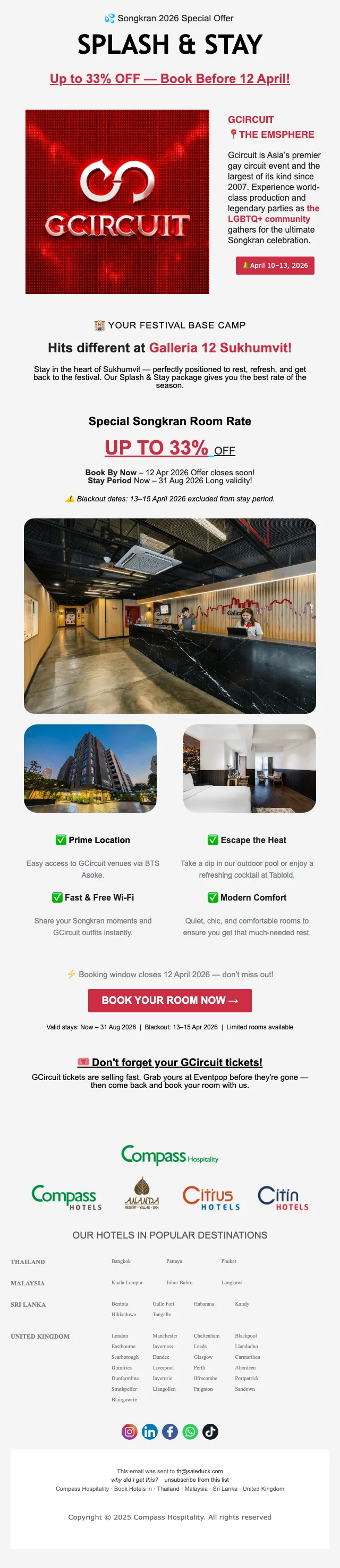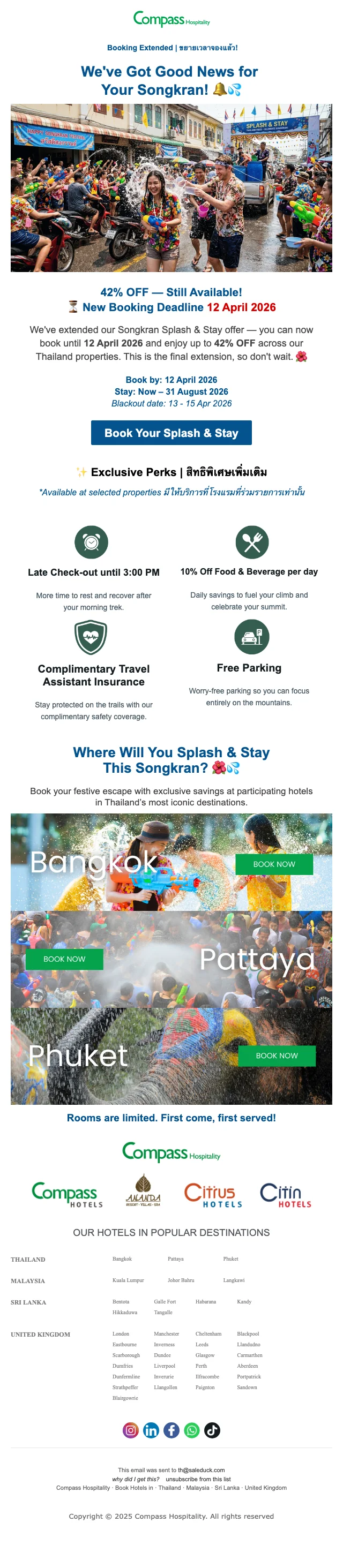 เมื่อคุณทำการสมัครสมาชิก กับ คอมพาส ฮอสพิทอลิตี้ คุณจะได้รับข่าวสารทางอีเมลล์ อัพเดตตลอดเวลา และ รับโปรโมชั่นก่อนใคร ซึ่งลดกว่า 80% พร้อมคูปองโค้ดมากมาย ยิ่งไปกว่านั้น เมื่อจองครั้งแรก รับคูปองส่วนลดทันที 25%