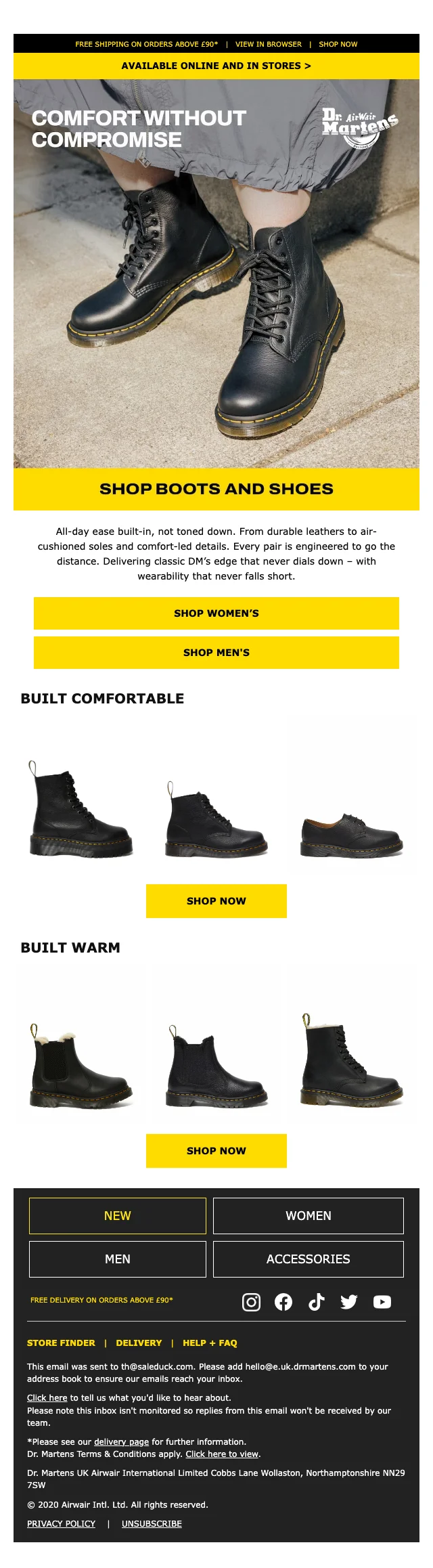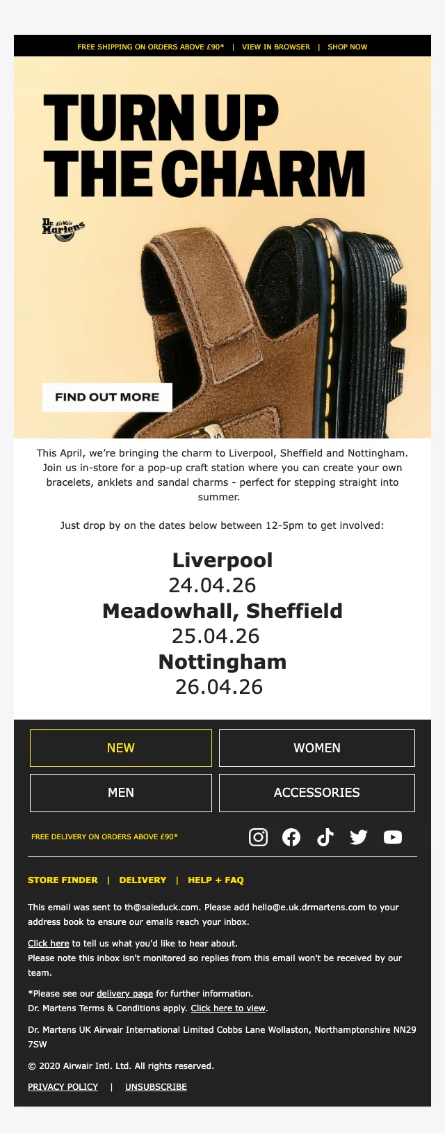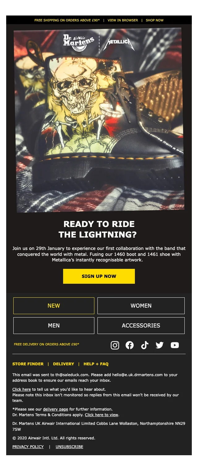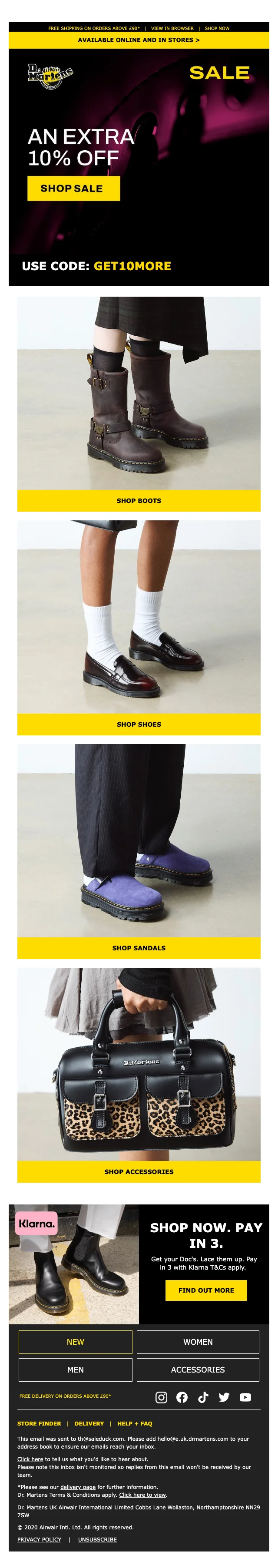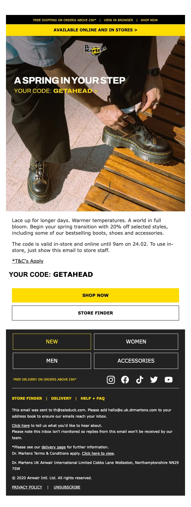 ถ้าคุณสั่งซื้อสินค้าจากร้านค้าออนไลน์ของ Dr. Martens เป็นครั้งแรก คุณจะได้รับส่วนลด 10% ทันที เพียงแค่กรอกอีเมล์เพื่อ Subscribe ง่ายๆ เท่านั้น